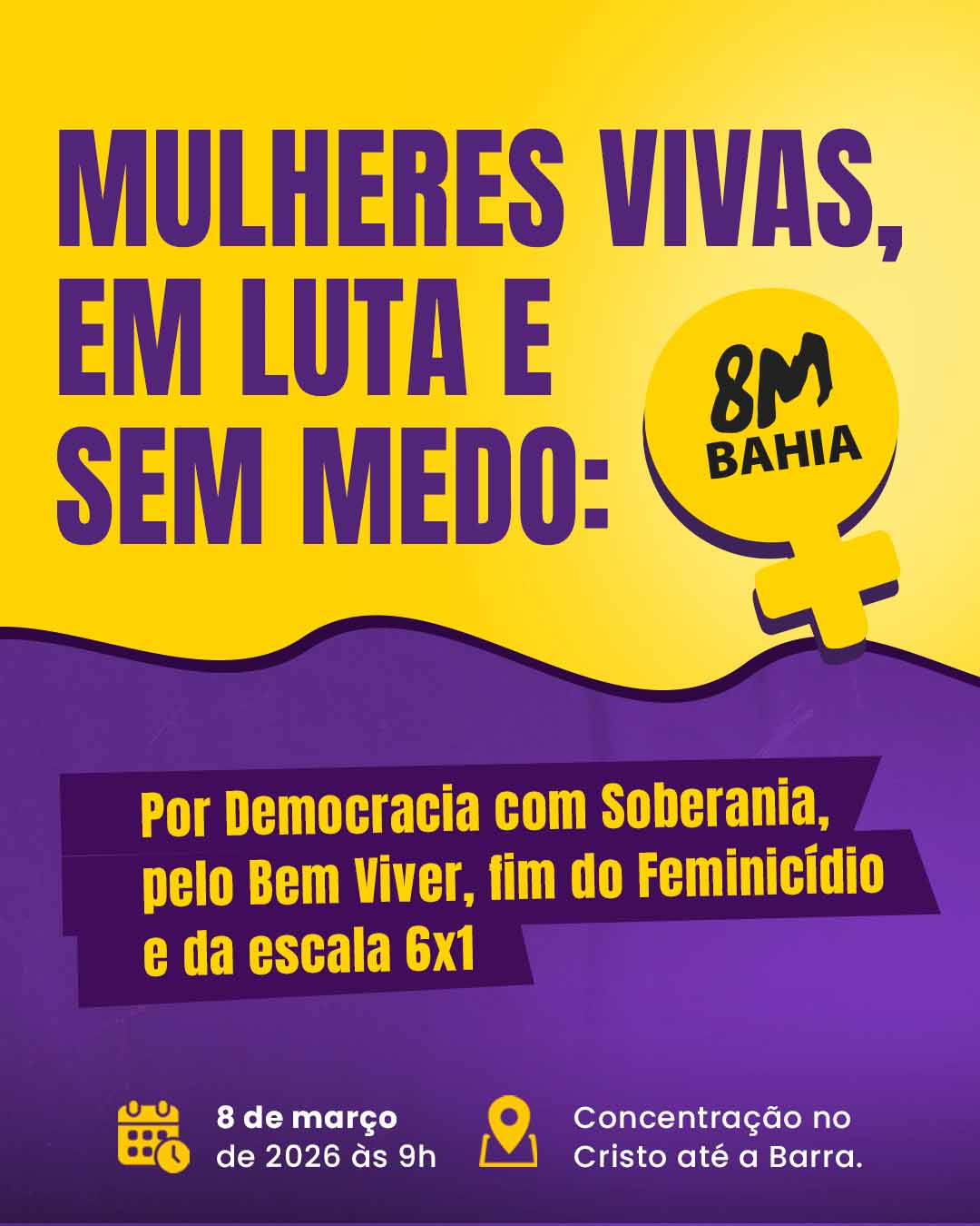 acontece anualmente em todo país e promete transformar indignação em força política. Trata-se do ato “Mulheres vivas, em luta e sem medo: Por Democracia com soberania, pelo Bem Viver, fim do feminicídio e escala 6×1”, que ocorre no dia 08 (domingo), com concentração às 9h, no Cristo, seguindo em caminhada até o Farol da Barra, em Salvador.