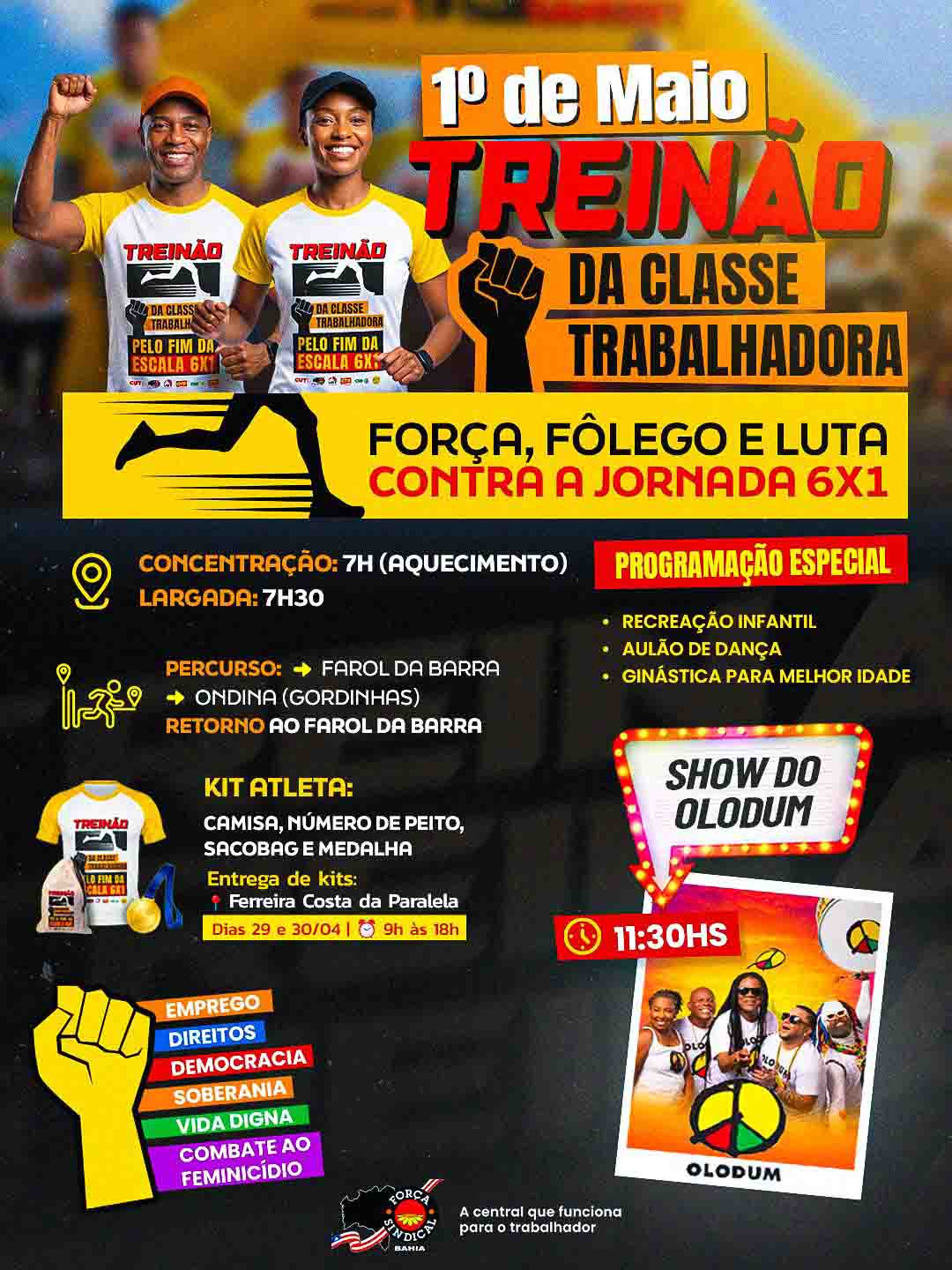 A programação será realizada no Farol da Barra, a partir das 7h, com o “Treinão da Classe Trabalhadora”. A atividade esportiva terá percurso de 5 km, entre o Farol da Barra e Ondina, simbolizando resistência, saúde e mobilização coletiva. A proposta integra bem-estar e conscientização, ampliando o engajamento da população nas pautas trabalhistas.