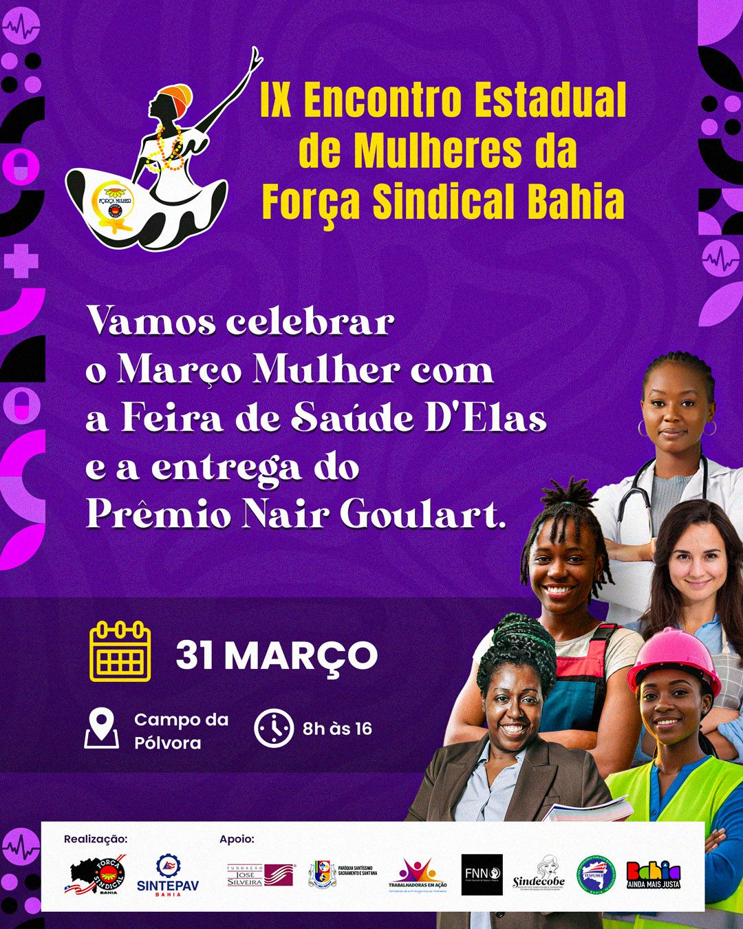 A Força Sindical Bahia promove, no próximo dia 31 de março, o IX Encontro Estadual de Mulheres Trabalhadoras, em Salvador, como parte das ações do Março Mulher 2026. A programação acontecerá das 8h às 16h, no Campo da Pólvora, e a entrega do Prêmio Nair Goulart, a partir das 13h.
